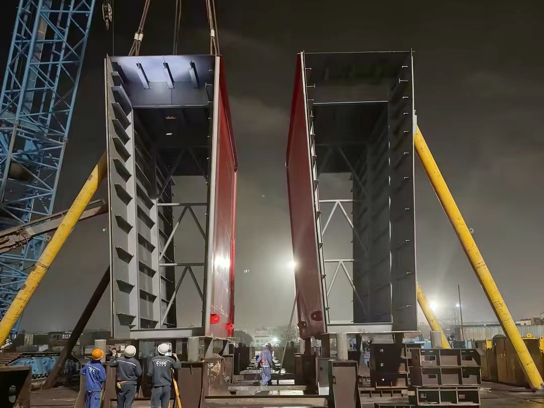 11月8日,公司承建的400t*150m門式起重機(jī)項(xiàng)目首批四個(gè)主梁分段完成裝船,發(fā)運(yùn)至廣船國(guó)際文沖修造進(jìn)行現(xiàn)場(chǎng)總組。11月11日,400t*150m門式起重機(jī)項(xiàng)目在安裝現(xiàn)場(chǎng)順利完成主梁四個(gè)分段中組吊裝定位。
